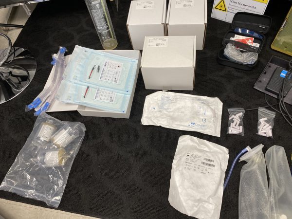 Simultaneous Lasing and Suction: 1470 nm diode device, AngelTM radial emission lasing fibers in various diameters, vibrating device and cable, LipoSenseTM temperature control cannula and multi-use LipoTight fiber, including stripping and cleaving set. Sterile Fat Grafting Kit: micro-cannulas, precision needles in various diameters, anaerobic transfer, sterile canister for viable fat collection, and multiple syringe stand.